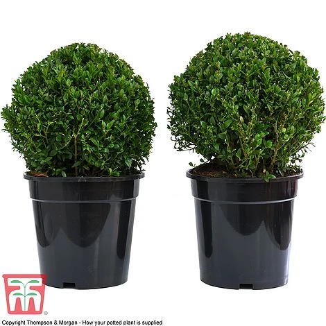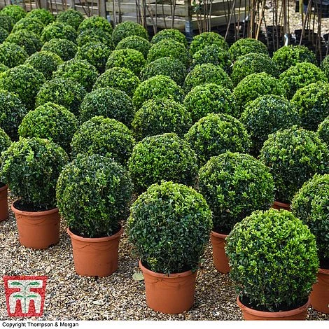 Add some style to doorways, gates and paths! A pair of carefully positioned Box balls are the perfect way to create an elegant entranceway. These neatly clipped evergreen shrubs make a great feature planted in terracotta pots, adding formality, structure and year round interest to your garden. Buxus sempervirens is well known for its neatly clipped appearance and slow growth rate which makes it conveniently low maintenance. Supplied as 28cm (11″) diameter ball in a 23cm pot. Grows up to 3m (9’) if left unpruned.