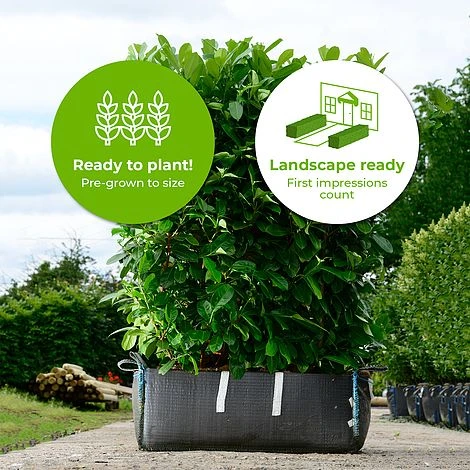Cherry Laurel Hedging in a Ready Bag is the perfect choice if you are looking to reinvigorate your garden with an instant hedge that provides a colourful, natural finish. The Prunus Rotundifolia Readybag Hedge boasts generous leaves which are large, dark and shining green; vibrant white candles flowers in spring; followed by bright red berries which fade to black come autumn. This species of readybag hedge is quite vigorous and should be trimmed regularly for best results – reaching an average height of 150-200cm when maintained correctly. Left untrimmed however, this Cherry Laurel Hedging can reach up to 5 metres in ideal conditions – leaving you and your loved ones with a spectacular evergreen backdrop guaranteed to please all year round.