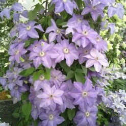 Looking exquisitely fragile and yet superbly robust, Clematis alpina is a tough, mountain species which survives temperatures down to -40 and doesn’t demand any attention. In return, it bears masses of dainty, nodding blue flowers with prominent white stamens from March to mid May, followed by fluffy seedheads. Aside from removing any dead or damaged growth, routine pruning is not required. Grow on a wall or support, scramble up a shrub or plant in a patio container. Height: 3m (9′). Spread: 1.5m (5′).