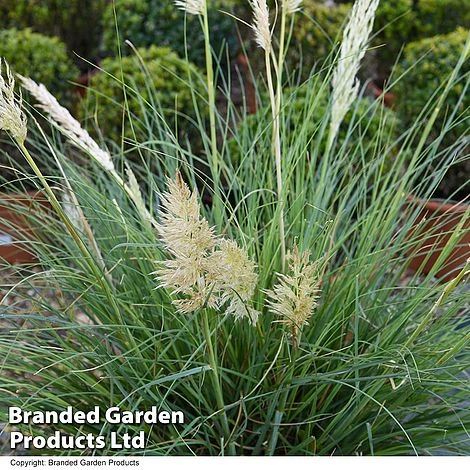 This mini version of the majestic pampas grass allows even small-space gardeners to enjoy this wonderful evergreen grass, providing useful all-year-round texture and structure. Reaching only 70cm high, Cortaderia selloana ‘Minipampas Silver’ forms a sturdy clump of stiff, narrow green foliage with white longitudinal stripes. From August, it throws up silky flower plumes that create a strong focal point in borders and large containers. Height: 70cm (27in). Spread: 65cm (25in).