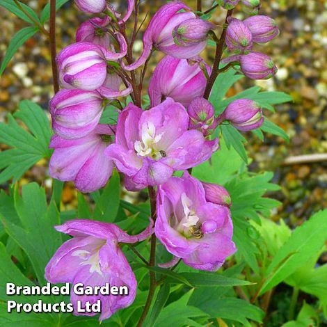 Named after the ‘lily maid of Astolat’ who, according to Arthurian legend, died of unrequited love, you are sure to fall head over heels for the dreamy pink spires of this romantic delphinium. A Pacific Giant hybrid, this is a tall variety – adding height and drama to borders. The large, semi-double, soft pink flowers are studded with a dark bee and are excellent for pollinating insects. Height up to 1.75cm (70”). Spread: 60cm (24”).