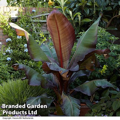 Add some tropical drama to your patio with this striking Ensete ‘Ethiopian Black Banana’. This tender banana has an astonishing growth rate and with regular feeding and watering it will rapidly become a spectacular focal point. A thick, leafy trunk rises into giant, sail-like leaves, burnished red and sporting dark red midribs. Surround it with exotic bedding plants in hot, tropical colours and channel a jungle vibe! RHS Award of Garden Merit. Height: 5m (16.4ft). Spread: 4m (13ft).