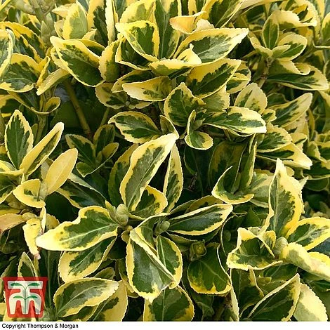 This colourful hardy evergreen brings a permanent splash of colour to the garden. The glossy green leaves are edged with dazzling gold margins that catch and reflect the light – perfect for brightening up those lightly shaded corners of the garden. With maturity, it occasionally produces early summer flowers which are followed by greenish-pink fruits. This fearless shrub is tolerant of sun, partial shade, coastal conditions, and exposed windy locations. Euonymus japonicus ‘Ovatus Aureus’ is a tough ‘all rounder’ that well deserves its RHS Award of Garden Merit. Height: 100cm (39″). Spread: 150cm (59″).