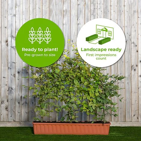 Hornbeam Hedging 1m Troughs are a great way to add an instant hedge to any garden. Its British native plant is hardy and compatible with many soil types so it will grow in any location. The Hornbeam’s leaves will stay naturally on the branches over winter, whereas the autumn leaves turn yellow adding colour to your garden during this season. If you keep up regular trimming of the Hornbeam trough hedging, it gives a formal look and can really show off your garden during evening gatherings and dinners. If you want to maximize its beauty, Hornbeam Hedging is the perfect choice!
