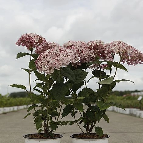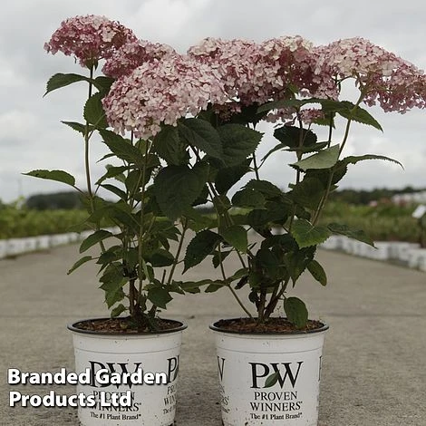 The latest innovation in the Incrediball series, Hydrangea arborescens ‘Sweet Annabelle’ features the same huge flowerheads on strong stems, this time in a silvery pink. Dark raspberry buds open to massive pale pink blooms, before finally adopting greenish tones. ‘Sweet Annabelle’ flowers on both old and new wood, providing an extended bloom period. Excellent for borders in shade or sun where the soil remains moist. It also makes a useful container plant for shady areas next to the house. Height and spread: 120cm (4ft).