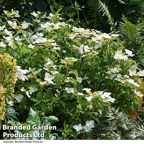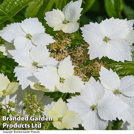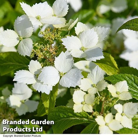 We are proud to present Hydrangea ‘Cloud Nine’, a product of T&M’s own breeding. Masses of white lacecap flowers blanket the plant for months on end, offset by glossy green leaves. With striking serrated edges to the petals, the large flowers open a pale lime green before fading to brilliant white. Especially useful in tricky shady areas, this hardy shrub makes a great patio plant and brings height and structure to a border. Height and spread: 120cm (4ft).