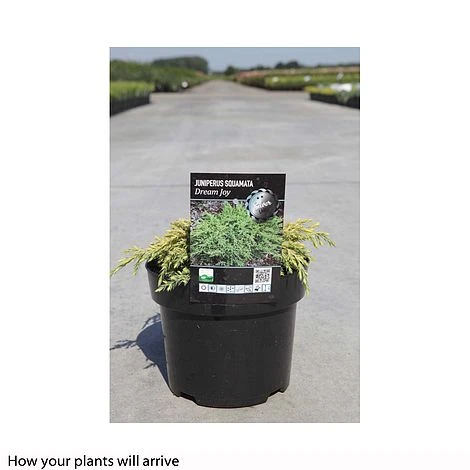 An attractive Flaky Juniper which bears bright yellow-green foliage that gradually tones down to blue with maturity, particularly during the winter months. This is particularly noticeable as new growth begins in spring, creating a superb two-tone effect. Juniperus squamata ‘Dream Joy’ is delightfully compact, making it suitable for even the smallest of gardens. This slow growing, dwarf conifer is ideal for creating a low mound of feathered evergreen foliage in borders and rockeries. Height: 50cm (20″). Spread: 100cm (39″).