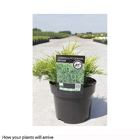 The gently arching branches of Juniperus x pfitzeriana ‘Old Gold’ are densely cloaked in golden needle-like foliage. This spreading Juniper has a low growing habit that ultimately forms a flat-topped mound. Junipers make fine specimen shrubs, and this one holds its colour particularly well throughout the year, making it well worth a spot in your conifer bed or placed among other evergreens in borders. This conifer has also been awarded a coveted RHS AGM for its excellent garden performance. Height: 1m (3′). Spread: 2.5m (8′).