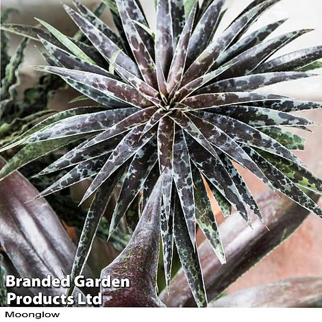 - Mangave ‘Moonglow’ – straight, narrow, silvery blue-green leaves with large purple blotches. Height: 25cm (10in). Spread: 50cm (20in).