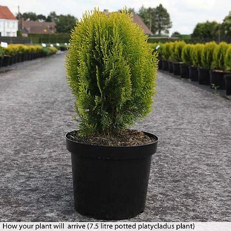 The Dwarf Oriental Thuja is a delightfully compact conifer. These neat, upright trees produce weatherproof, golden-green foliage which is gently aromatic when bruised. Platycladus orientalis ‘Aurea Nana’ is slow-growing, making it ideal for small gardens, rockeries or patio containers. These conifers are tough, evergreen plants that will grow in almost any soil or situation, requiring absolutely no maintenance and lasting for many years. Height and spread: 90cm (36″).