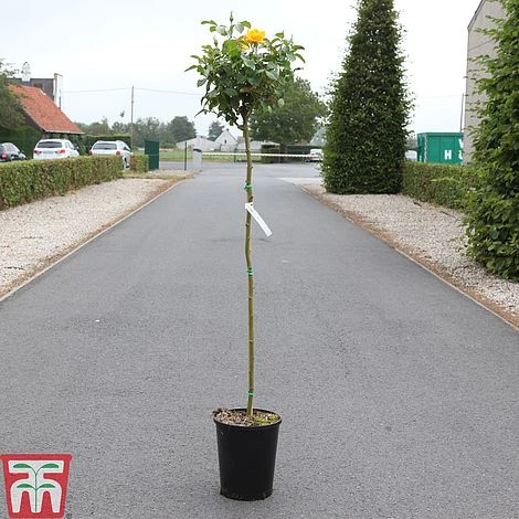 The lightly fragranced, golden yellow flowers of Rose ‘Mellgold’ boast a central boss of yellow stamens. The semi-double blooms appear continuously from early summer through to autumn. This bushy shrub rose makes an ideal container variety, and looks equally good planted in the mixed herbaceous border, or a rose bed. Height and spread: 1m (39″).
