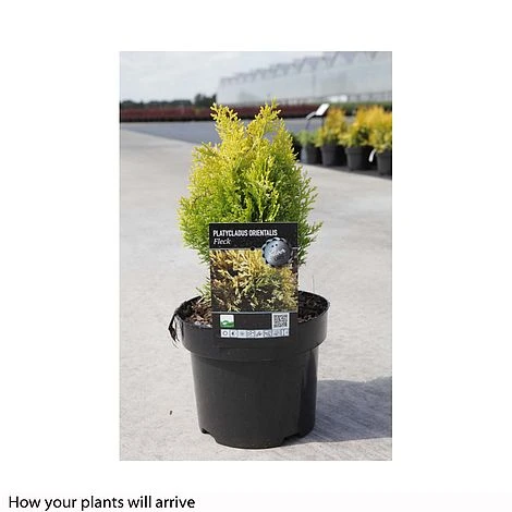 With delicately variegated foliage, Thuja orientalis ‘Fleck’ is an ideal plant for a focal point in the centre of a bed or border where it can really show off its shape and colour. The rich green, almost scale-like leaves sit upright on hardy evergreen shrub, each one lightly flecked with creamy white splashes and forming into a rounded, oval shape. Very easy to look after and needing little or no maintenance, Oriental Thuja can be used in a variety of ways in the garden and is well worth considering for patio planting too. Height: 180cm (71″). Spread: 100cm (39″).
