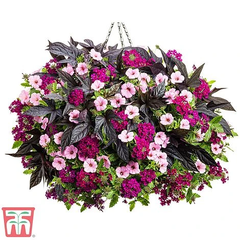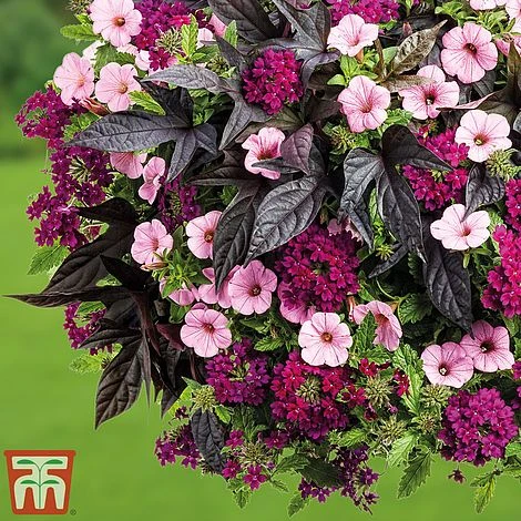 Collection contains: Ipomoea ‘Sweet Caroline Purple’, Verbena Vepita ‘Dark Magenta’ and Petunia ‘Vista Bubblegum’. Height: 25cm (10″). Spread: 45cm (18″).